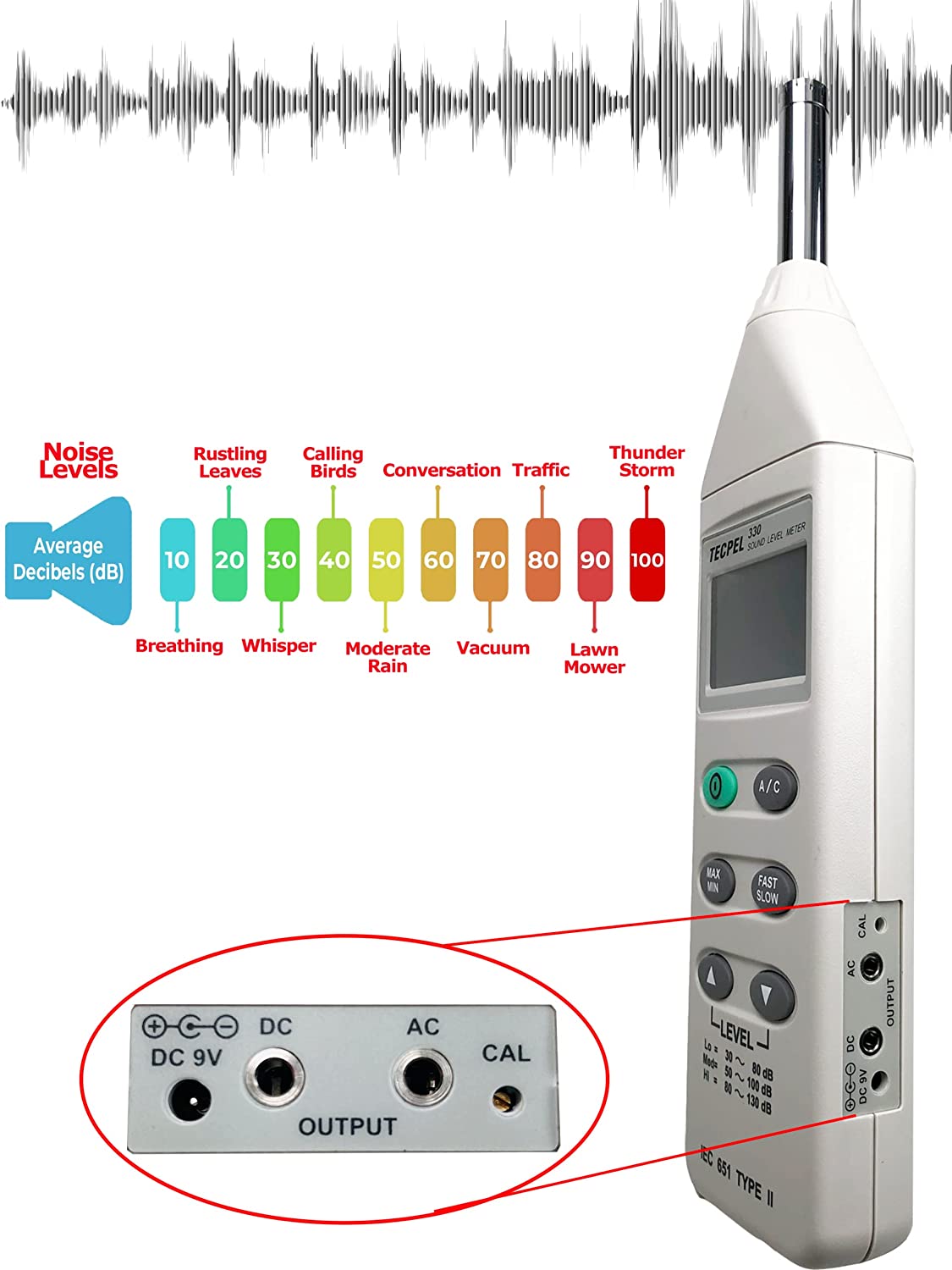 - Level Range : Lo: 30 ~ 80dB ; Med: 50~ 100dB, Hi: 80~ 130dB;