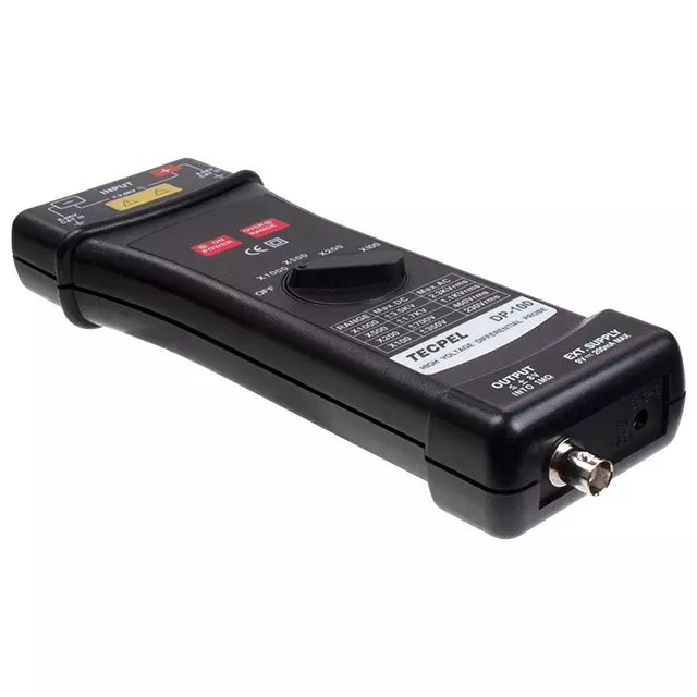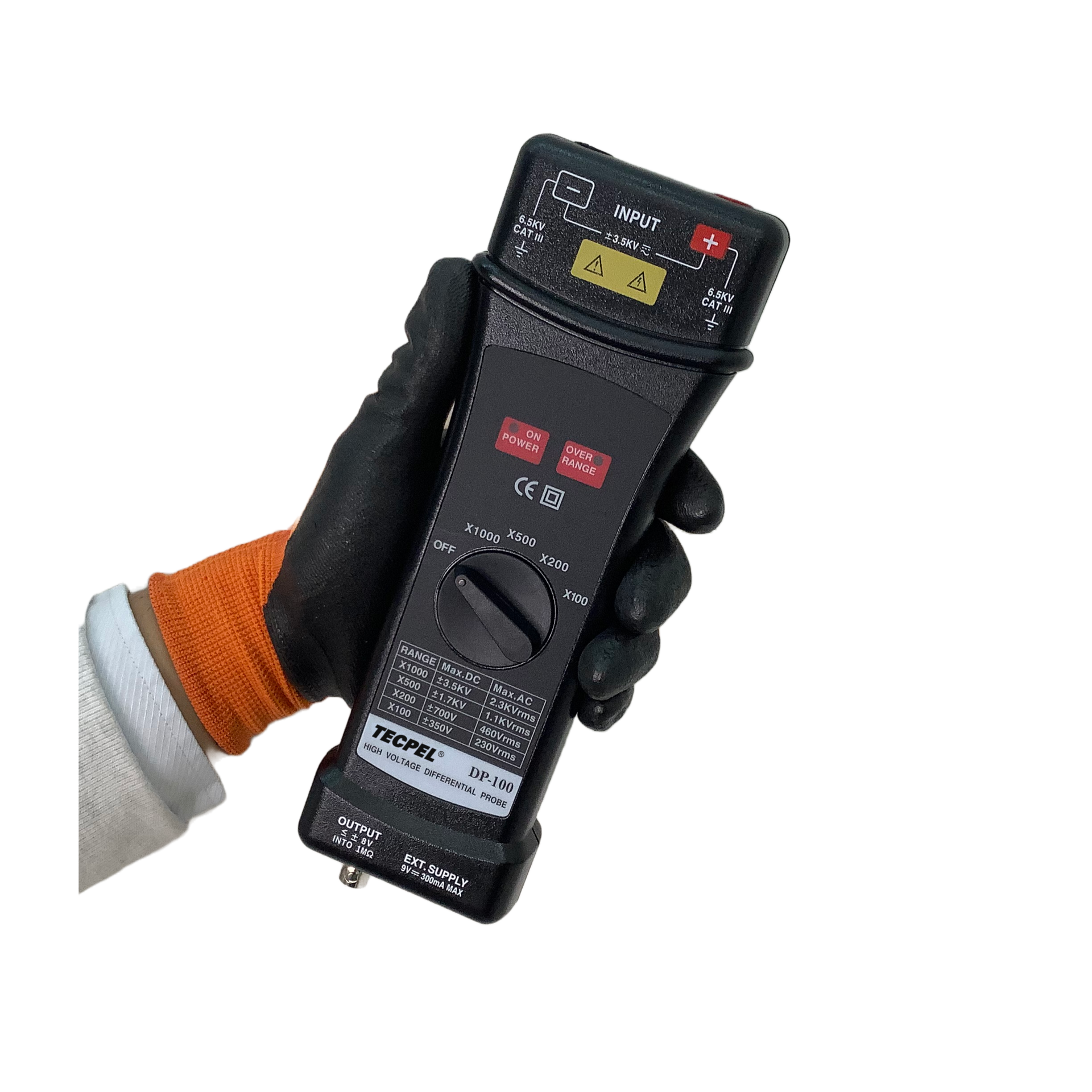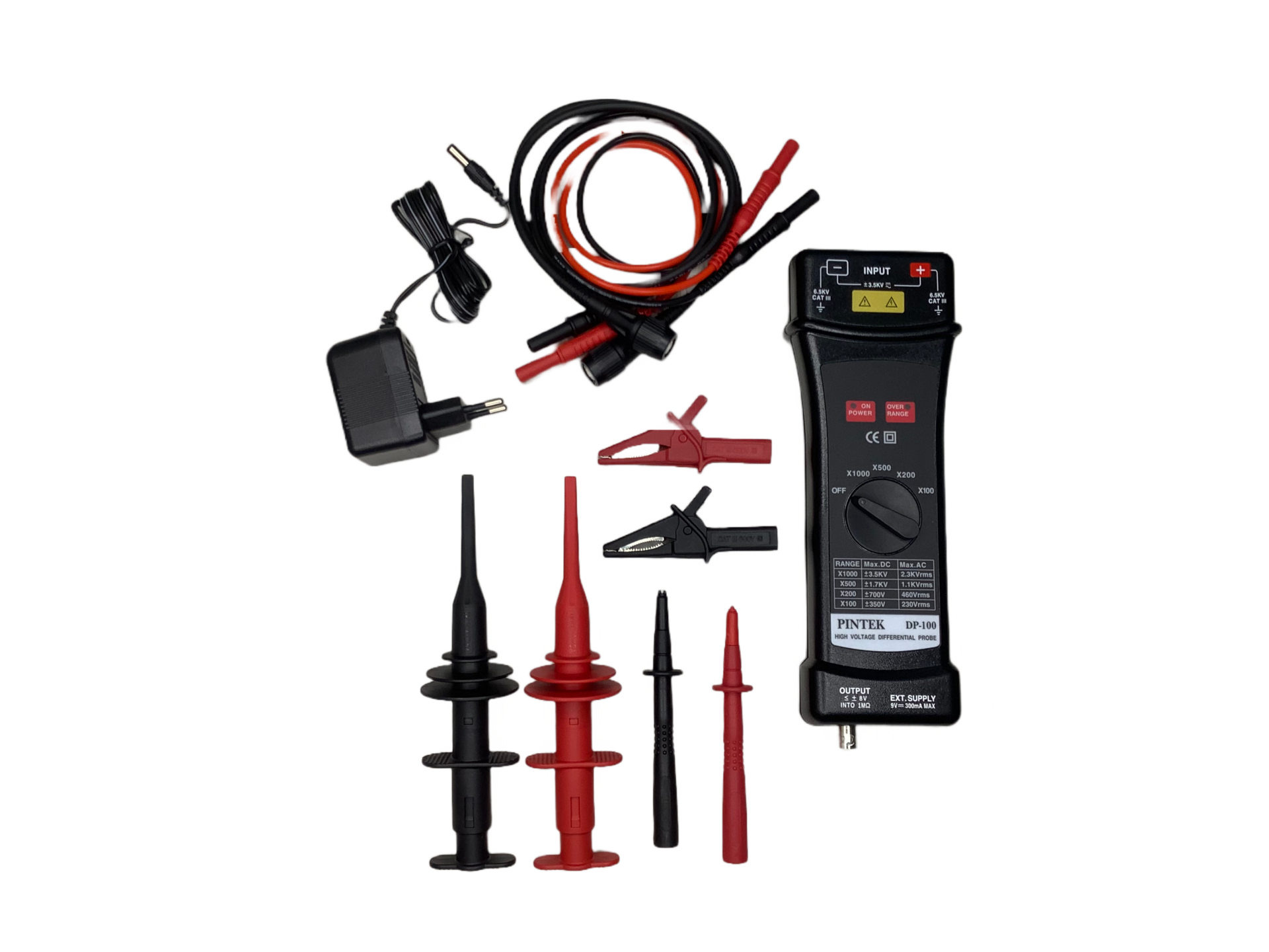 The DP-100 Differential probe provides a safety means for measuring differential voltage to all models of oscilloscope. The DP-100 coverts the high differential voltage (<=7000 peak) into a low voltage (<=7.0v, with reference to the earth) and display on the oscilloscopes.