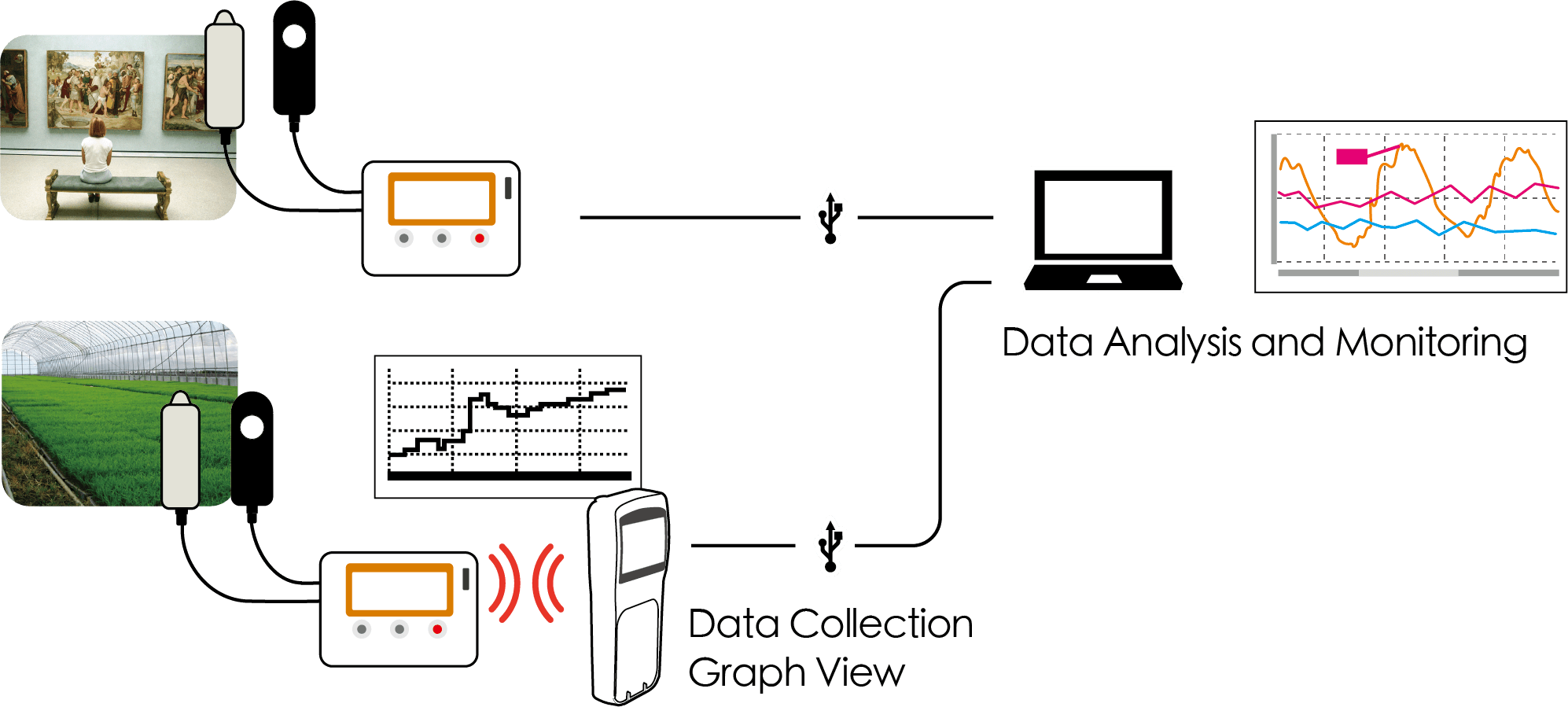 Not only can recorded data be easily downloaded to a PC via USB communication, but it can also be collected from data loggers via infrared communication to our T&D Data Collector TR-57DCi (sold separately). The TR-57DCi enables the user to gather and check recorded data on the spot without having to manually gather the data loggers.