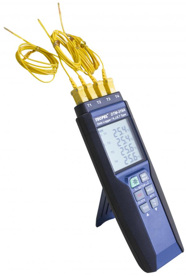 A temperature logger with 4 channels, compatible with various types of K. J. E. T. thermocouples, with 4 K-type thermocouples, and with the software included being able to download the stored information to a PC and graph it in Excel or directly with its own software of the thermometer data logger.