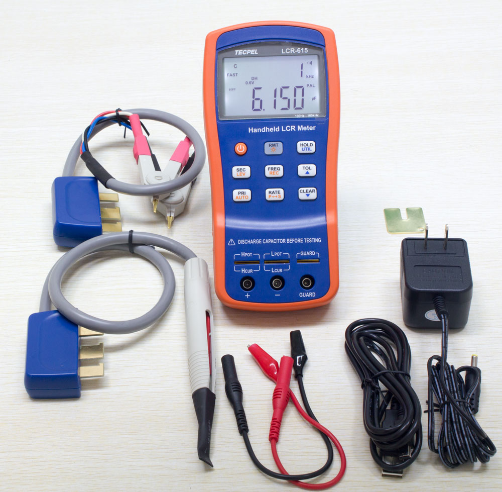 ■ With its advanced impedance test technology, TECPEL has launched this new LCR-615 handheld LCR meters. This LCR-615 currently possess the most powerful functions and outstanding performance in this industry comparable with bench LCR meters. Meanwhile it is the achievement of TECPEL after years of efforts and research in the passive-component testing field. The LCR-615 apply the ultra-low power consumption design and high density SMD assembly techniques and can simultaneously display primary and secondary parameters on a LCD display with backlight. The dual-color shell is gorgeously once shaped; and functions are easy to operate. The test frequency is up to 100 kHz, the readings of primary parameter 40,000 counts and the resolution of dissipation factor 0.0,001. Accurate and convenient measurements of passive-components can be achieved in different occasions for a long time. In order to meet different market demand, multiple signal level and DCR test function are increased on this LCR-615. The test accuracy can reach 0.1%. With USB interface, This LCR-615 series can conveniently communicate with a PC and be remotely controlled by a PC. In order to satisfy the increasing test requirements for SMD and balance the different needs for performance and price, two types of 4-terminal Kelvin test tweezers are equipped with accessoires for users’ choice.