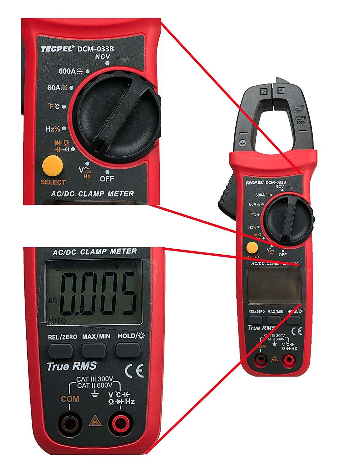 DCM-033B AC/DC Digital Clamp Meter. it is an alternating current tester with a 6000 digits display. The minimum displayable is 0.01A.