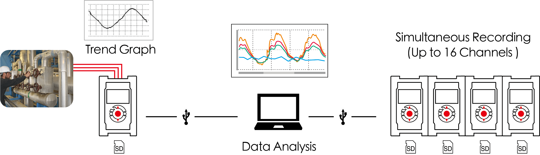Measure and record up to four channels in One logger. By coupling four units together, it is possible to simultaneously record up to 16 channels. This multi-channel battery powered data logger has an SD memory card slot with auto transfer capabilities to ensure your data is not lost when internal memory becomes full. It also comes with a touch panel for easy operation